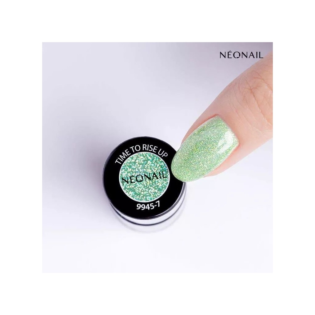 Time To Rise Up – transparent UV gel polish with green particles and flash holo effect;