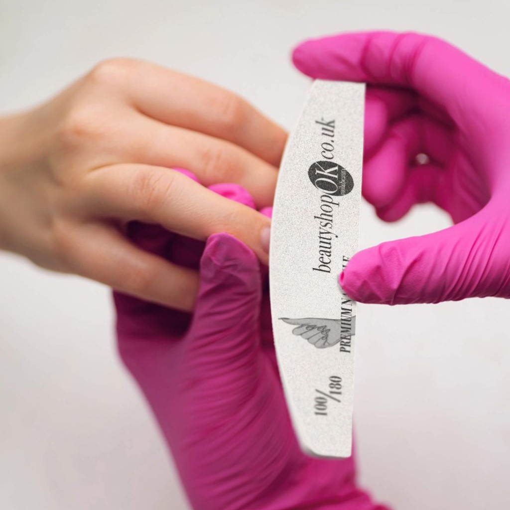 180 is the most popular choice among stylists. This highly versatile grit is successfully used for shortening nails, filing and shaping hybrid material, as well as leveling gel material.