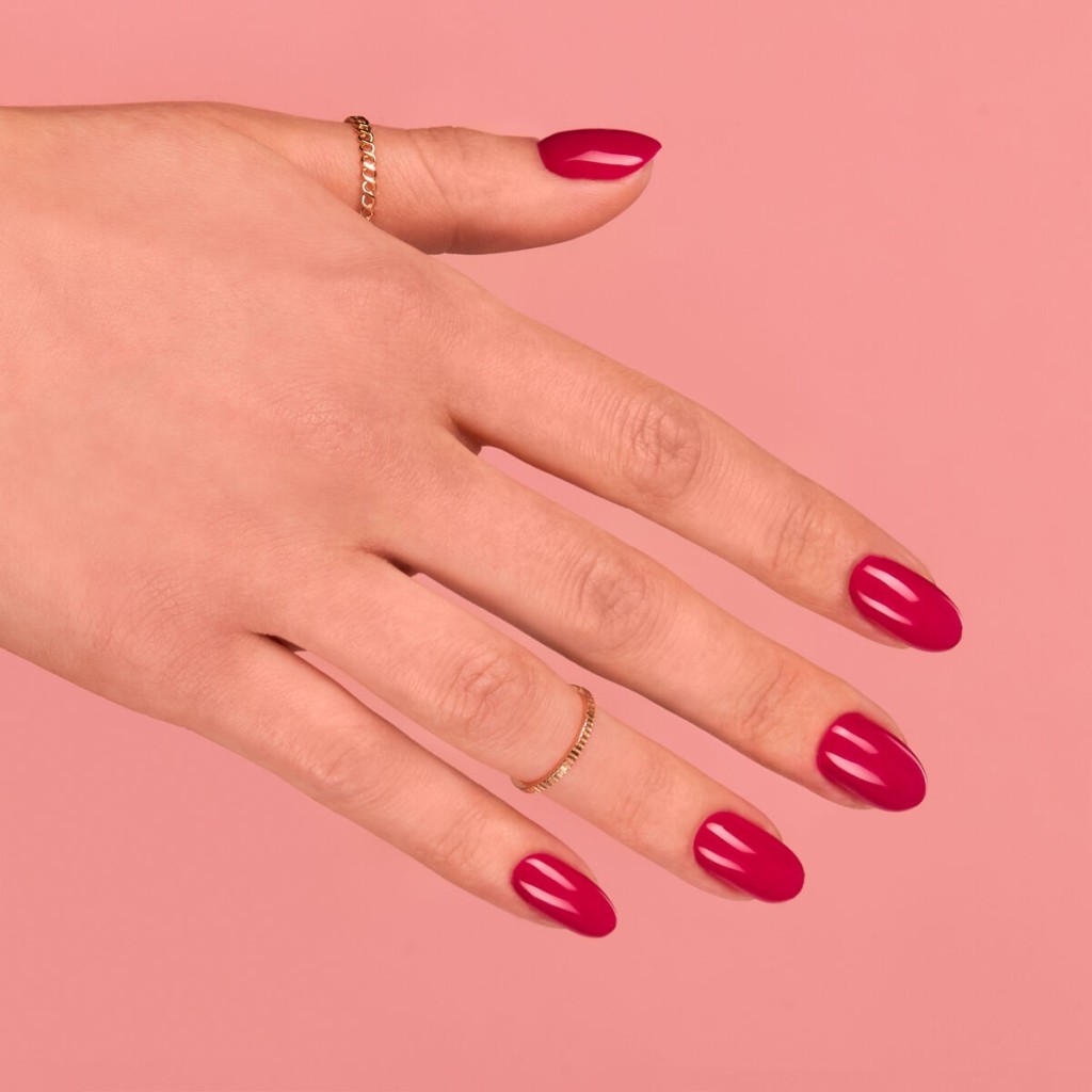 Deep red in a warm shade. The innovative 3-in-1 system saves you time - it's a base, color, and topcoat all in one. You'll do your manicure in no time!