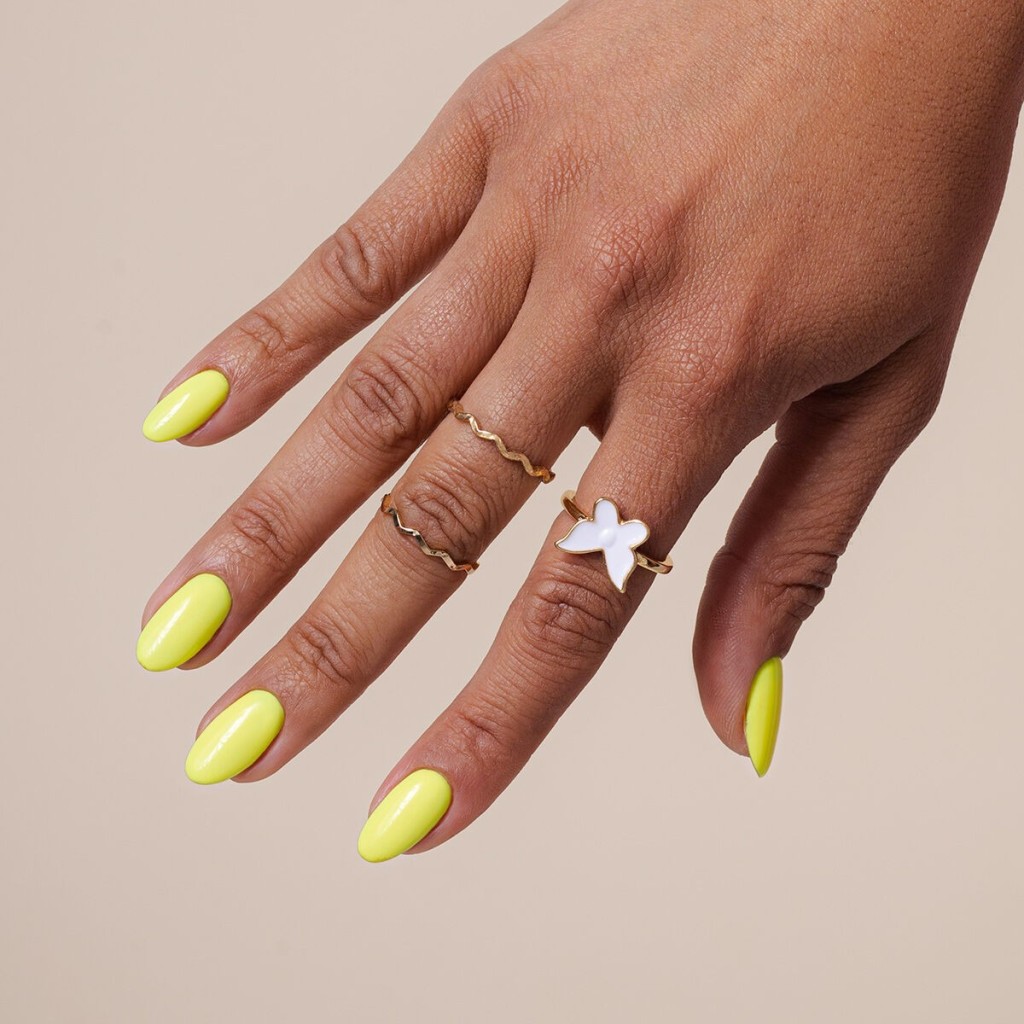 Neon nail polish in a warm, sunny shade with a hint of banana. Its sunny, energizing color guarantees a positive boost.